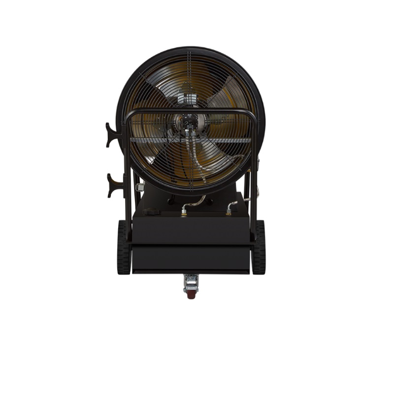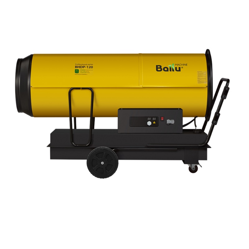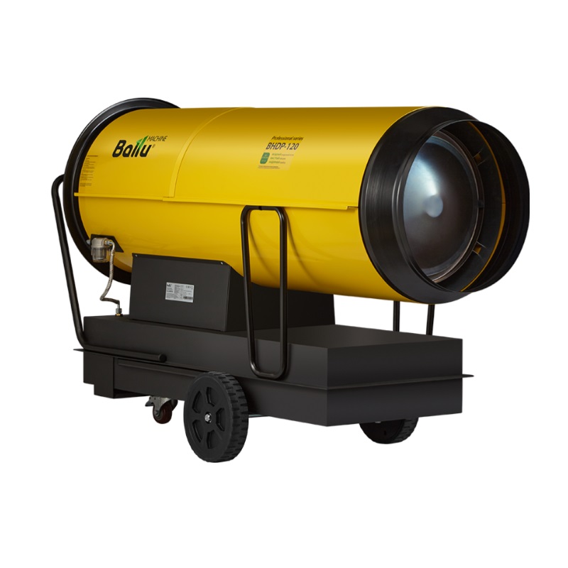 Воздухонагреватель дизельный прямого нагрева Ballu BHDP-120 серии Tundra предназначен для обогрева нежилых помещений и локального прогрева рабочих поверхностей. Тепловая мощность прибора составляет 120кВт. При работе дизельной пушки воздушный поток, проходя через защитную решётку – втягивается в камеру сгорания. Там он смешивается с распылённым форсункой дизельным топливом, которое при помощи мощного насоса под высоким давлением подаётся из топливного бака, образуя воздушно – топливную смесь. При помощи 12kV электродов смесь поджигается и сгорает, а затем — выбрасывается наружу, смешиваясь с продуктами сгорания и с основной массой поступаемого воздуха, тем самым нагревая его. Теплоотражающий экран, расположенный в передней торцевой части корпуса прибора- служит препятствием для вырывающегося открытого пламени и обеспечивает равномерный прогрев помещения либо обогреваемой рабочей поверхности.