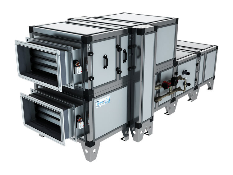 Эта модель позволяет создать систему приточно-вытяжной вентиляции с рекуперацией и охлаждением воздуха. Она комплектуется роторным рекуператором, водяным нагревателем, водяным охладителем, воздушными клапанами с электроприводом и возвратной пружиной, автоматикой с датчиками и пультом с цветным экраном.
